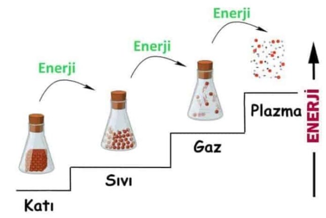 —Sıvı hal: Katının almış olduğu enerji ile sıkı dizilen atomlarının birbirlerinden uzaklaştıkları ve maddede oluşan bu hale de “sıvı hal” dendiği ve bu süreçle ilgili olarak buzun eriyerek su haline geçmesi verilecek. Yine bu bilgi demir-karbon diyagramında düşük karbonlu çeliğin yaklaşık 1500ºC’nin üzerinde sıvı hale geçtiği gösterilecek ve sıcaklığın bu değere gelinceye kadar demirde farklı kristal yapıların ve fazların (α-hacim merkezli kübik, γ-yüzey merkezli kübik, δ-hacim merkezli kübik, sıvı) oluştuğuna dikkat çekilecek. Dolayısıyla ısı enerjisinin hallerin dönüşümünde ne kadar etkili olduğu bir kez daha dile getirilmiş olacak. Sıvı dendiği zaman önce moleküler yapı kavramının akla gelmesi gerektiği özellikle vurgulanacak. —Gaz hali: Sıvı halde bulunan bir sıvının enerji alması ile atomlarının birbirlerinden daha da uzaklaşmasının söz konusu olduğu ve bu olayın sonucunda ortaya çıkan hale de “gaz hali” dendiği ifade edilecek. Gaz haline kaplama sisteminde kullanılan argon gazı verilecek. Gaz dendiği zaman önce atomik yapı kavramının akla gelmesi gerektiği özellikle vurgulanacak.