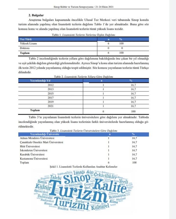 Araştırma kapsamında Ulusal Tez Merkezi veri tabanı üzerinde Sinop konulu ve turizm alanında